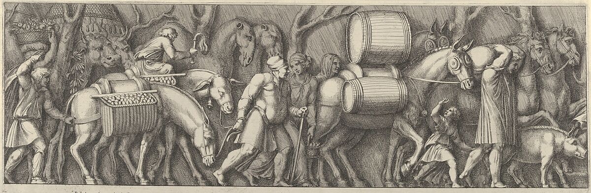 - Title: Plate 4: animals transporting goods being led by figures going to the right