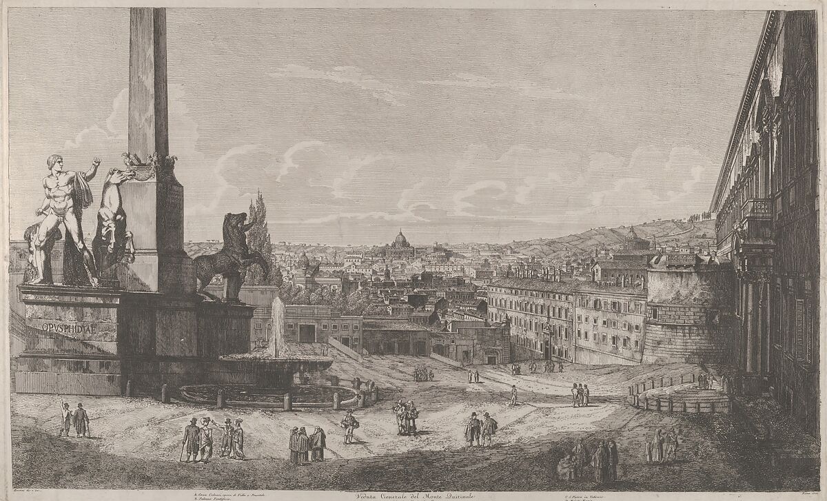 - Title: View of the Quirinal Hill in Rome with the fountain of the horse tamers at left, from "Le Antichita di Roma"