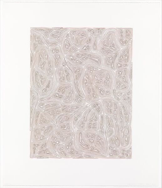 In his prints, paintings, drawings, and sculptures, Siena responds to a set of predetermined instructions that he calls visual algorithms. While the algorithms provide structure, Siena embraces the unpredictability inherent to his freehand approach: he draws repeating lines, irregular grids, and interlocking shapes without the aid of a ruler or other mechanical device. Squa Tront, which Siena engraved intermittently over the course of five years, reveals his adeptness with the labor-intensive technique of engraving.