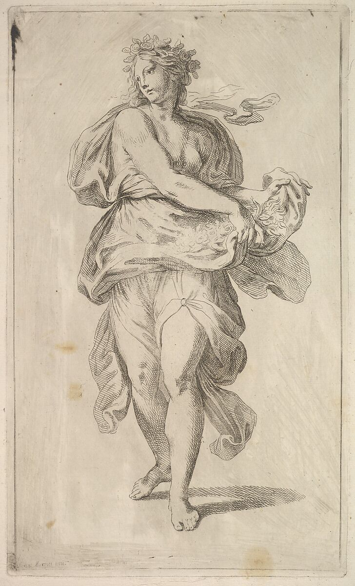 Drawing with a female dancing figure wearing a classical, draped robe, her arms and legs uncovered. Her head, turned three quarters to her right, is crowned with a wreath of roses and leaves; her curly hair flows behind her. She appears in motion: her weight rests on the left leg, in front, while the right leg is about to leave the ground; her arms float to her left.