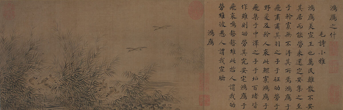 As emperor, Gaozong sponsored a number of painting and calligraphy projects that extolled the virtues and legitimacy of his “dynastic revival.” The largest of these undertakings was illustrating the more than three hundred poems of the Classic of Poetry, a work traditionally believed to have been compiled by Confucius (551–479 B.C.). Courtly Odes, Beginning with “Wild Geese,” from the Xiaoya section of the Classic, is part of this ambitious program.