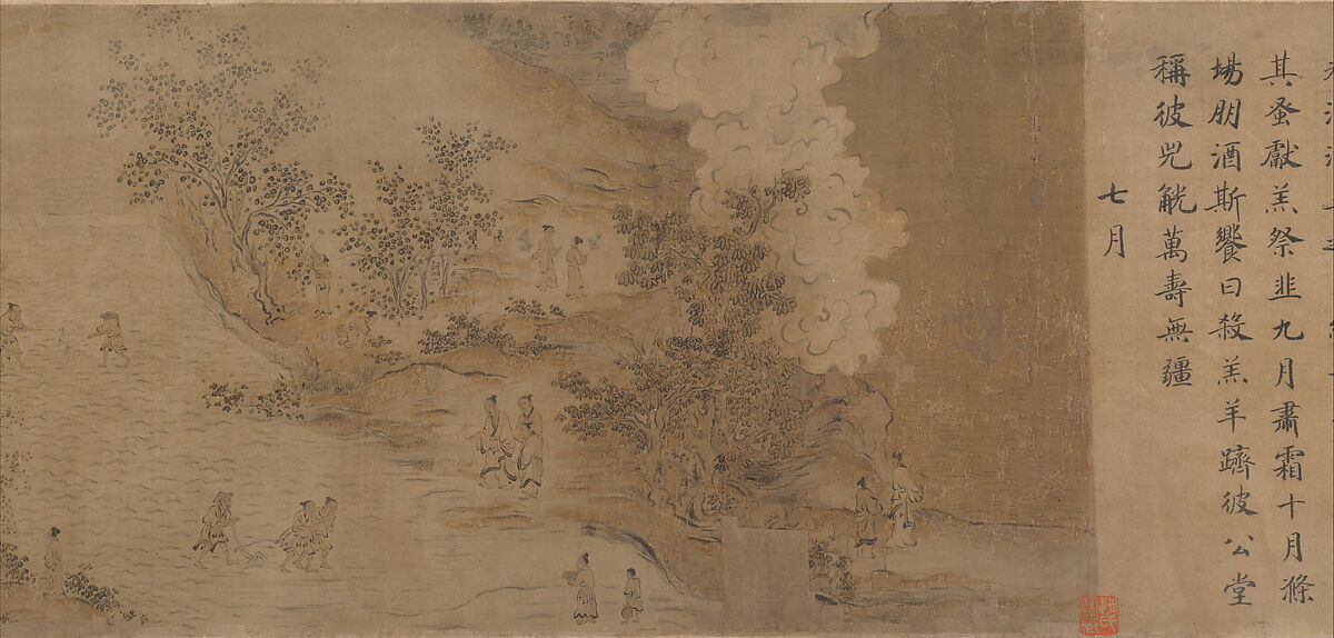 The poems illustrated in this scroll are known as the Odes of the State of Bin, for they were believed to have been the songs of Bin (in modern Shensi Province), the ancient homeland of the founders of the Zhou dynasty (ca. 1100–256 B.C.). These odes are the last in the section known as Guofeng ("Airs from the States"), which contains poems gathered from all over the realm so that the Zhou king might learn what his people were thinking and feeling.