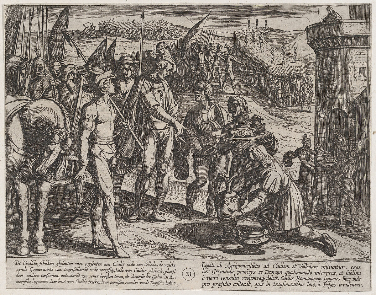 - Title: Plate 21: Envoys from Cologne Bring Presents to Civilis, from The War of the Romans Against the Batavians (Romanorvm et Batavorvm societas)