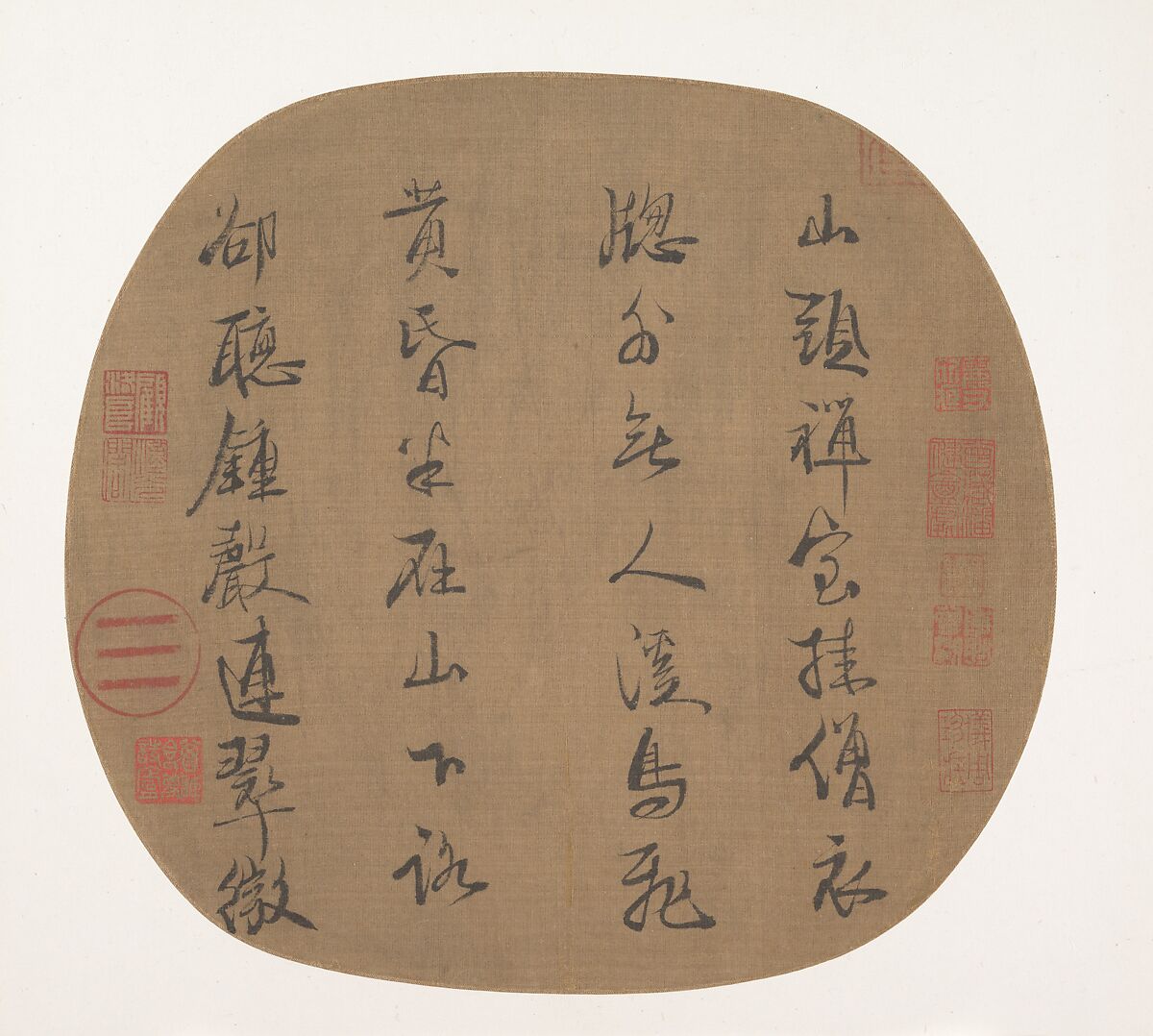 Like most imperial calligraphies, this fan is not signed or dated, but its distinctive writing style— the same as that of the couplet mounted together with Ma Lin's Landscape at Sunset (Nezu Museum, Tokyo) and dated 1254—clearly identifies it as a work by Lizong. The round seal showing the trigram qian ("Heaven"), used only by the emperor, confirms its imperial pedigree. The poem, though composed by Meng Haoran (689–740), perfectly describes the kind of atmospheric qualities that thirteenth-century painters, such as Ma Lin and Liang Kai, sought to evoke pictorially: