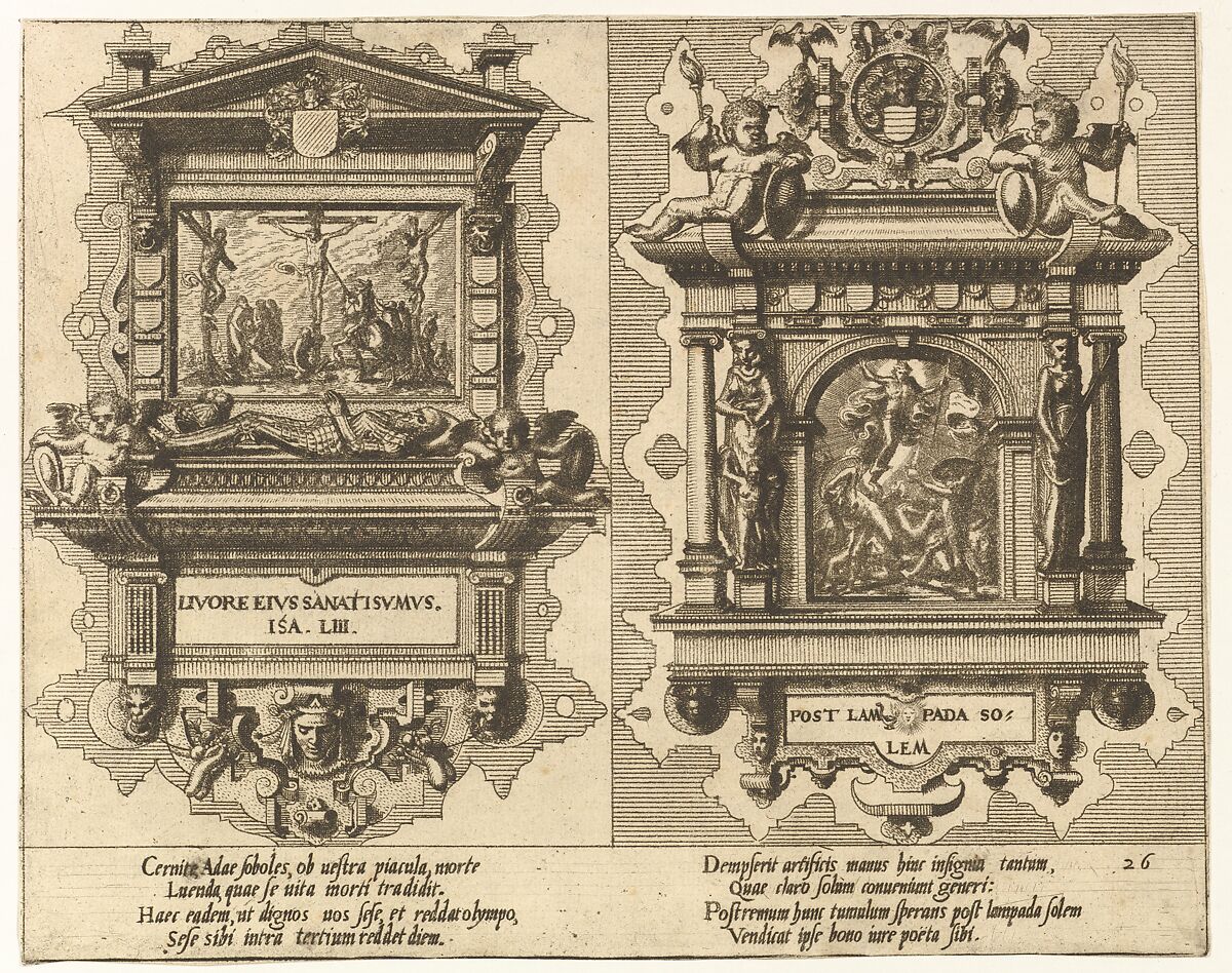 Two designs for funerary monuments to be placed onto a wall. The monument on the left is characterized the effigy of a sleeping man in harnas, placed before a large painting of the Crucifixion. The monument on the right shows a painting of the Last Judgement in the central compartment, flanked on either side by a cariatid and a Ionic pillar. A Latin inscription is added on a small panel below. Below the image as a whole, a Latin inscription is added, consisting of eight lines divided over two columns.