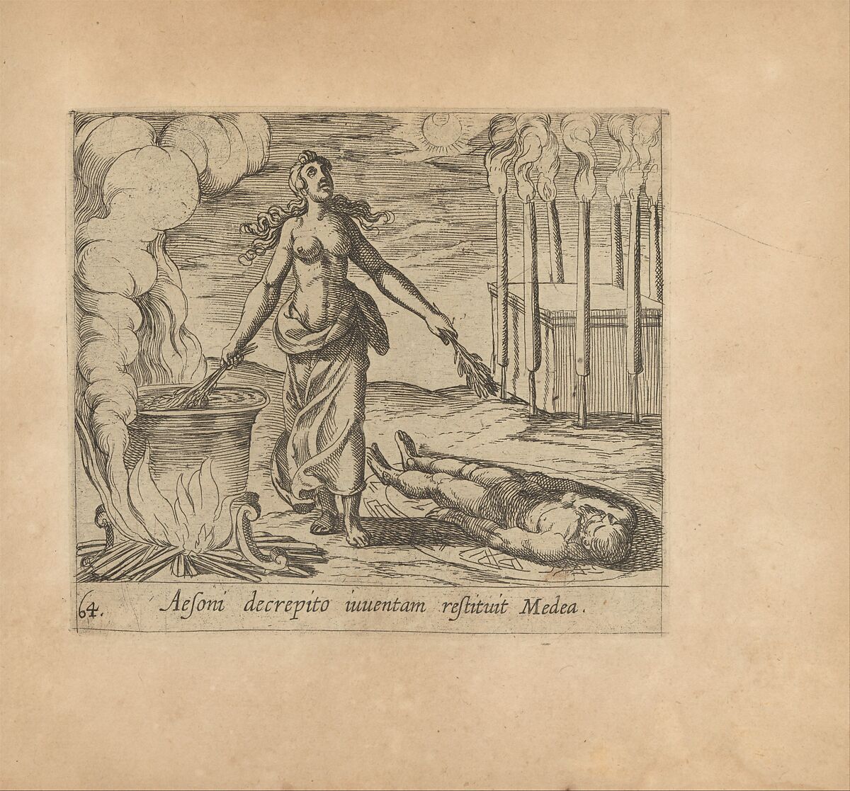 - Title: Medea Restoring Aeson's Youth (Aesoni decerptio iuventam restituit Medea), plate 64 from "The Metamorphoses of Ovid" (Metamorphosean Sive Transformationum)