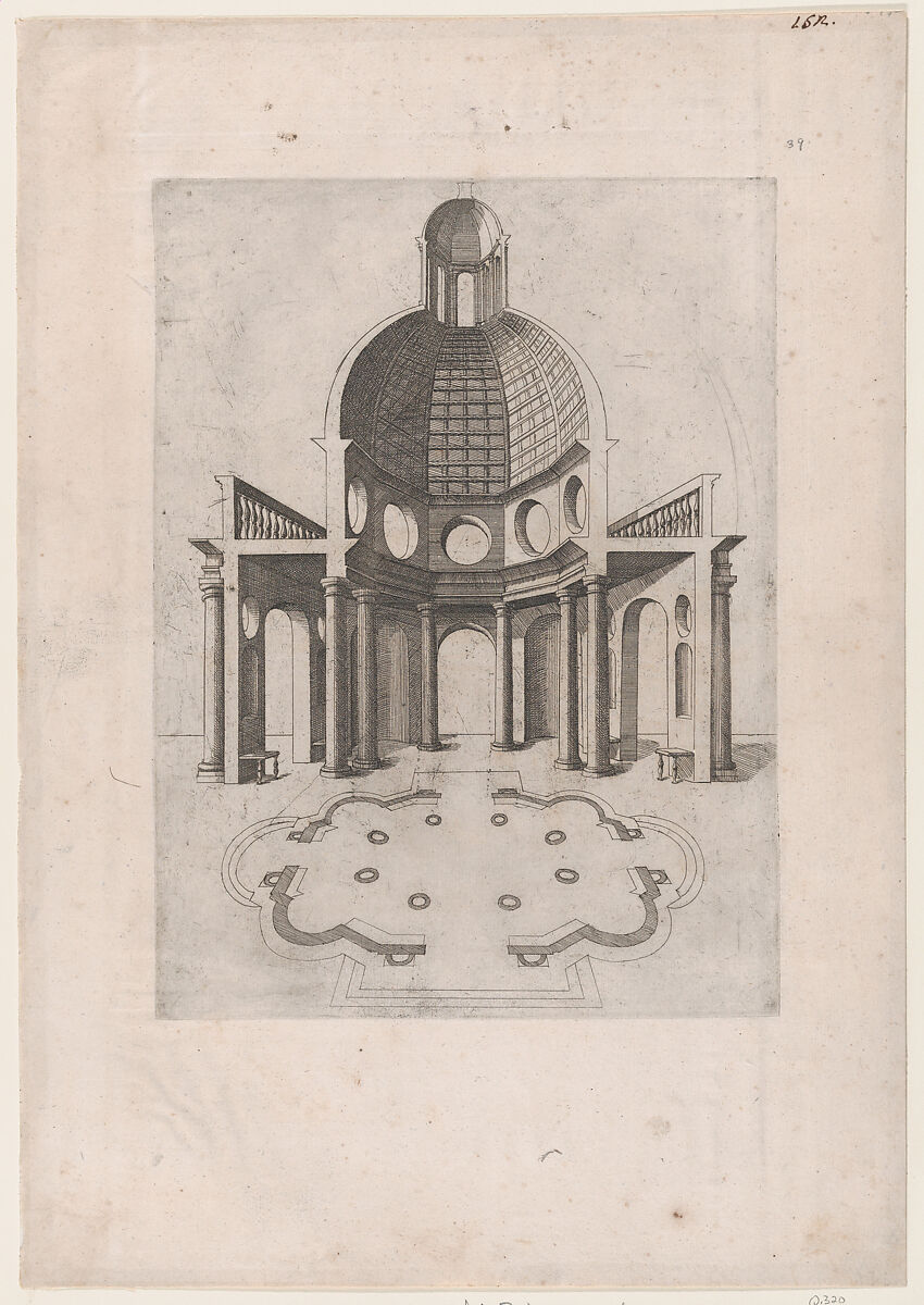 - Title: Interior and ground plan of an octagonal temple, from "Speculum Romanae Magnificentiae"