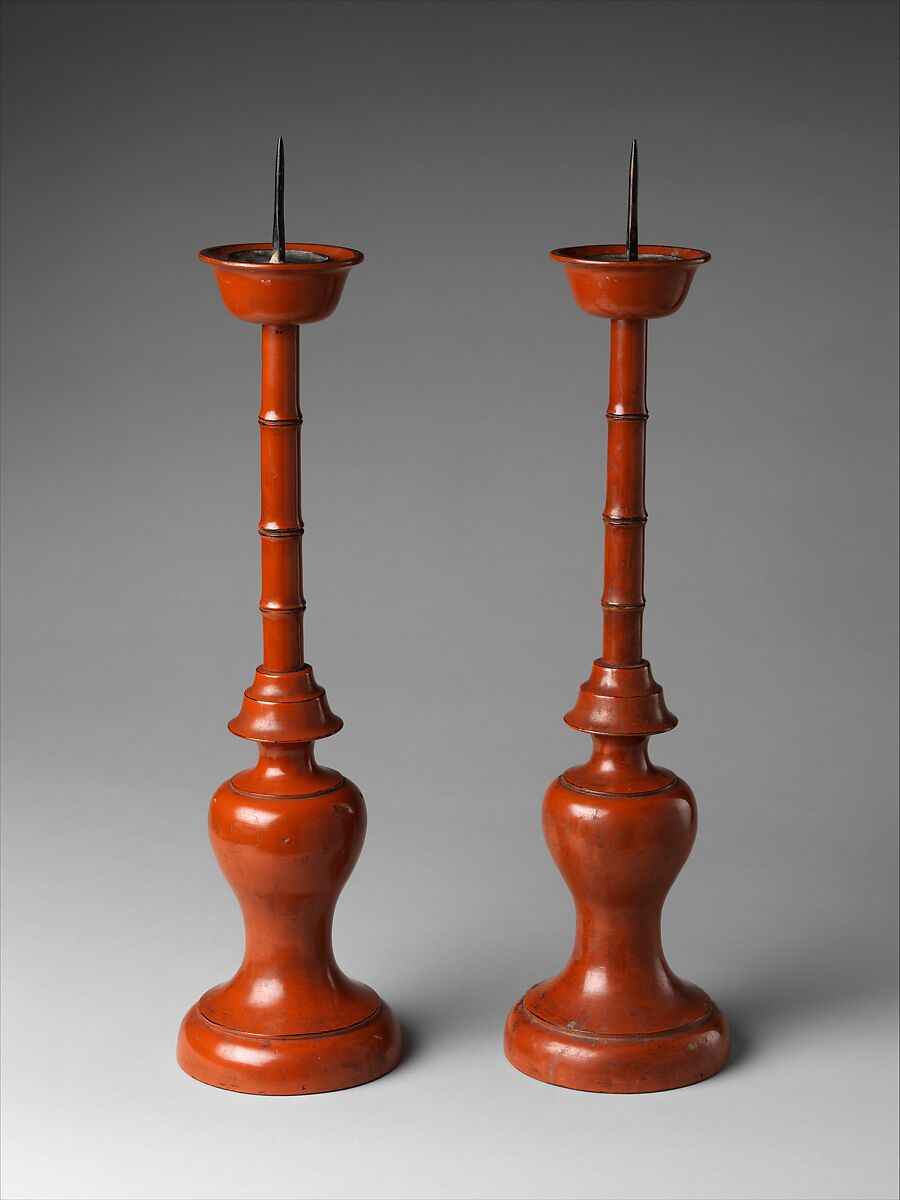 Candlesticks are rare among Negoro lacquers. These were probably originally placed before a Buddhist altar. The powerful curves of the base and the bamboo motif of the stem were formed on a lathe. Over years of use, the top layer of red lacquer has worn off, and the underlying black has become visible.