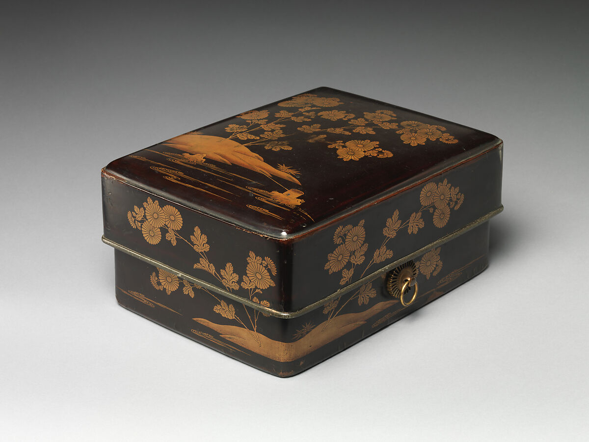 - Medium: Lacquered wood with gold togidashimaki-e on black lacquer