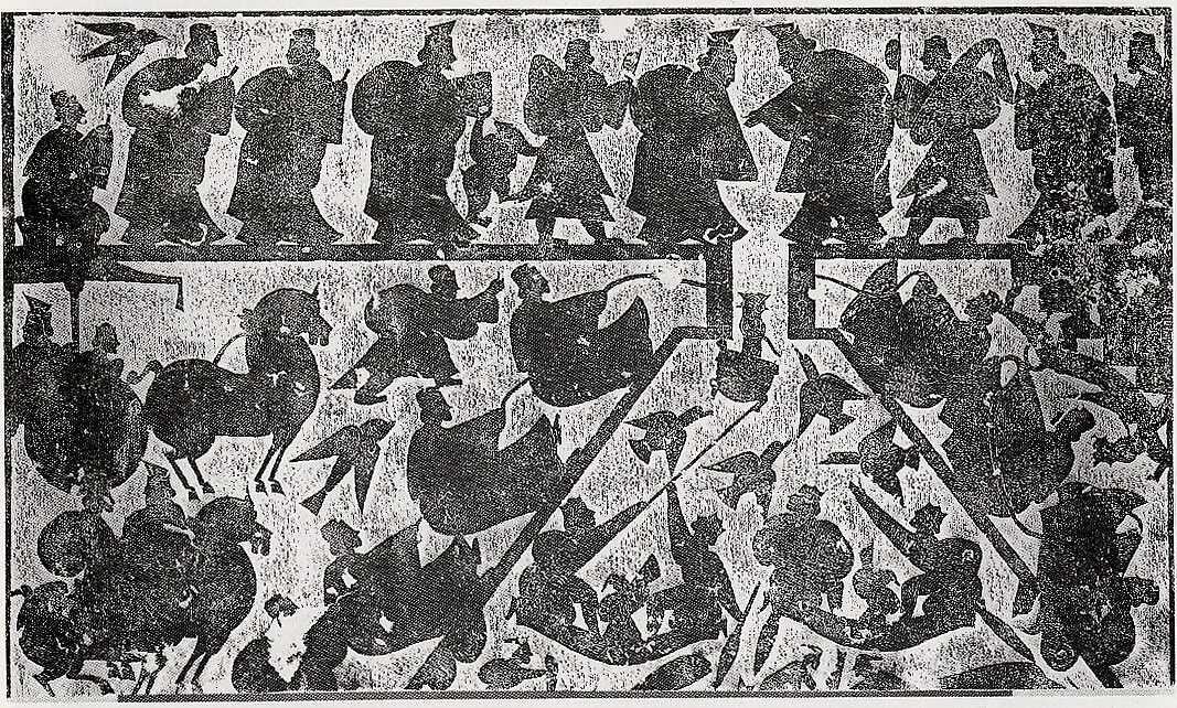 This rubbing was taken from a stone engraving on a chamber wall of the Wu Family Shrine in Jiaxiang, Shandong Province, constructed about 151 CE. It illustrates the failed attempt of the tyrannical first emperor of the Qin dynasty (r. 247–210 BCE) to retrieve from the Si River one of the legendary Nine Tripods, a symbol of the legitimacy of the state since antiquity.
