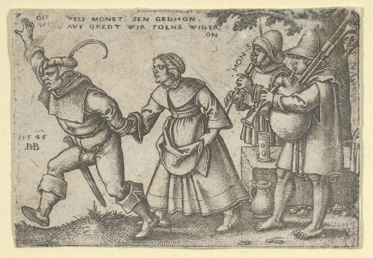 At left, a male figure leads a female to the left. At right, two figures playing bagpipes. From a series of ten prints.