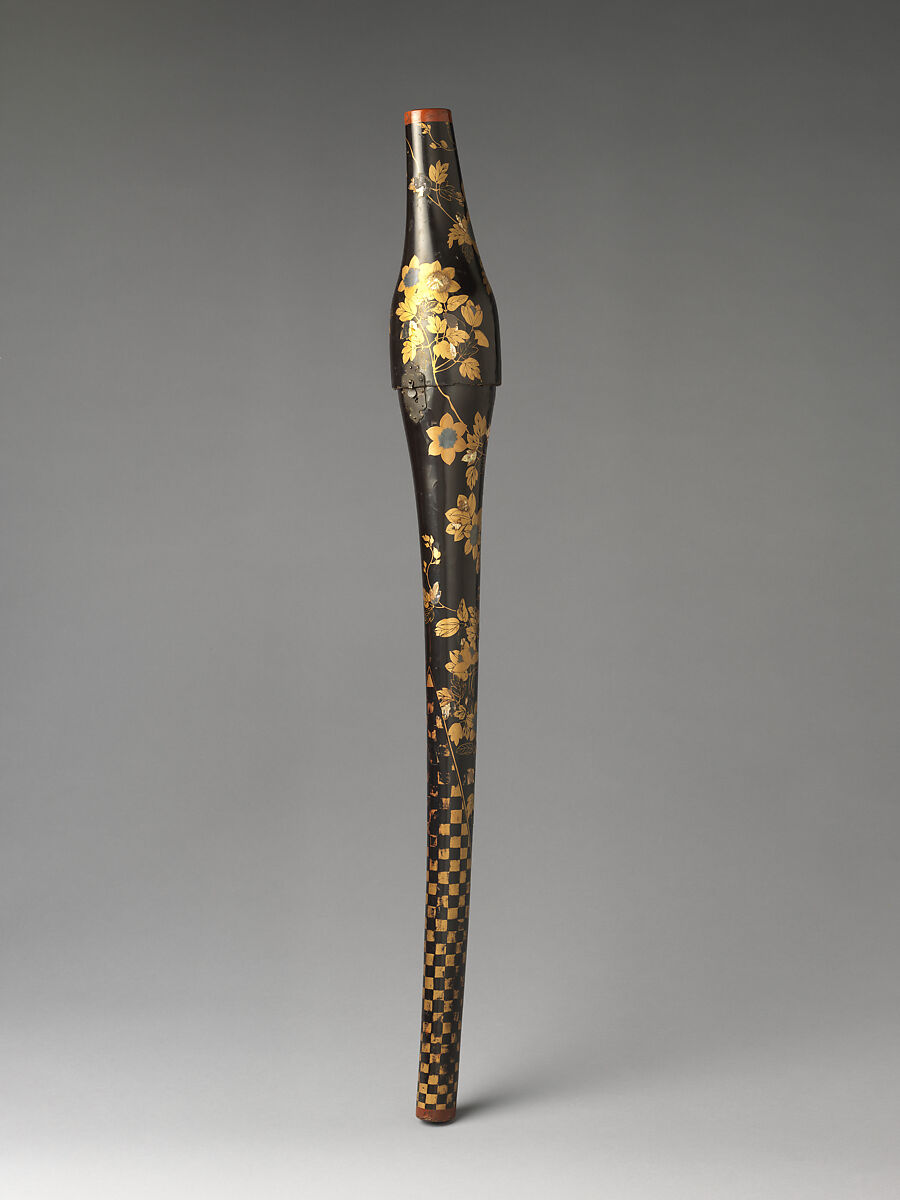 Decorative—and expensive—lacquer sword cases were made for carrying the most treasured swords of the daimyo (feudal lords) while traveling. Those made for presentation were especially richly embellished. This example has an elaborate design of clematis vines combined with a checkered pattern on its lower section. Associated with summer, the clematis is considered auspicious in Japan for its ability to climb upward on fences. The stylized, flat maki-e decoration of the case follows the Kōdaiji-style lacquers prepared in Kyoto in the Momoyama period (1573–1615) to suit the taste of the warlord Toyotomi Hideyoshi (1537–1598). Kōdaiji wares and those produced until the 1630s as export furniture for the Western market are strongly connected, as exemplified by the abstract geometric pattern and mother-of-pearl inlay here.