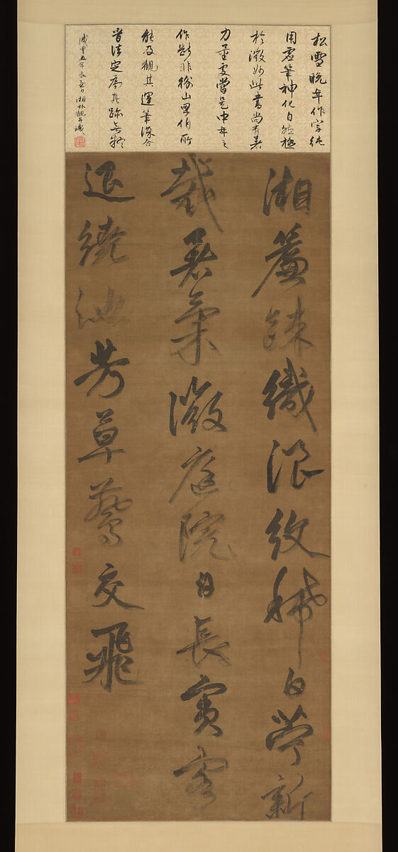 This work and another in the Xinxiang County Museum, Henan Province, are the only known calligraphic hanging scrolls associated with Zhao Mengfu. In both works,the large cursive script, written in a bold dry-brush, "flying-white" technique, and the loose structure of individual characters suggest a Ming-dynasty date.