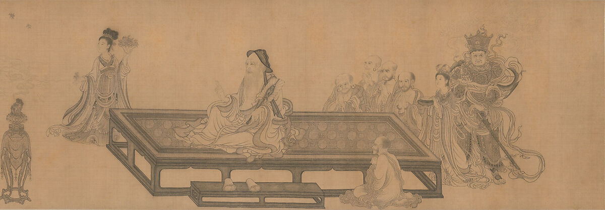 This handscroll depicts an episode from the Vimalakirti Sutra, the Buddhist scripture in which Vimalakirti, a layman, and Manjushri, the Bodhisattva of Wisdom, engage in a theological debate. According to the sutra, Vimalakirti proved the more subtle by remaining silent when asked to explain the ultimate meaning of the Buddhist Law. The subject appealed to China's Confucian elite, for it demonstrated how a cultured layman could surpass even a deity in his understanding of doctrine.