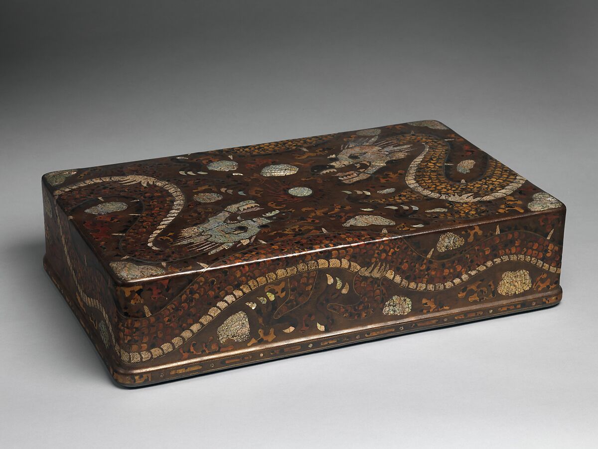 - Medium: Lacquer inlaid with mother-of-pearl, tortoiseshell, and ray skin
