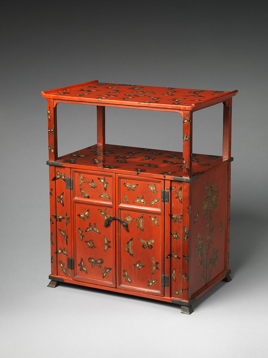Butterflies and flowers are often found in the visual arts of China and the Ryūkyū Islands in the eighteenth century. The butterflies decorating this cabinet were painted in black and gold lacquer and inlaid with pearl shell. The overall shape of the cabinet and the four small feet show parallels to Japanese art. A large opening in the shape of a swastika in the cabinet's back wall suggests that it was once used to house Buddhist sutras or religious paraphernalia.
