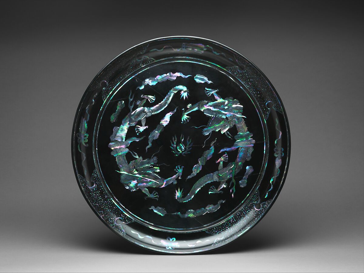 Historical records indicate that sets of thirty trays with matching basins were sent to the Qing court in Beijing from the Ryūkyū Islands at least three times during the eighteenth century. The two dragons chasing a pearl in the center of this tray have five claws on each foot, which indicates that they are imperial symbols. Large trays such as this remain in imperial collections in China and Taiwan, and it seems likely that they once belonged to the eighteenth-century sets. The dragons and other motifs are rendered with thin pieces of mother-of-pearl chosen for their bright colors. The disjunction between the heads of the dragons and the rest of their bodies is characteristic of Okinawan lacquer.