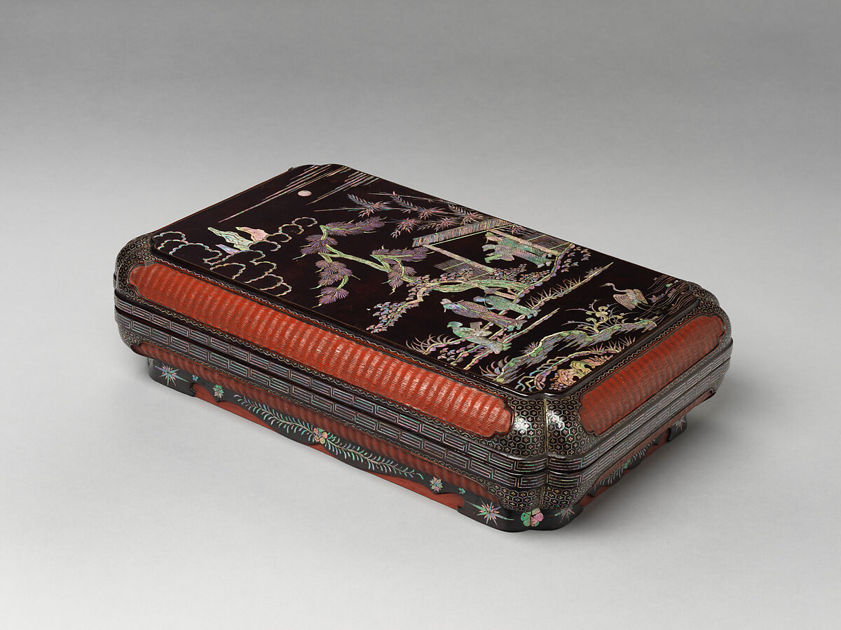 - Medium: Black lacquer with mother-of-pearl inlay and red-lacquered basketry panels