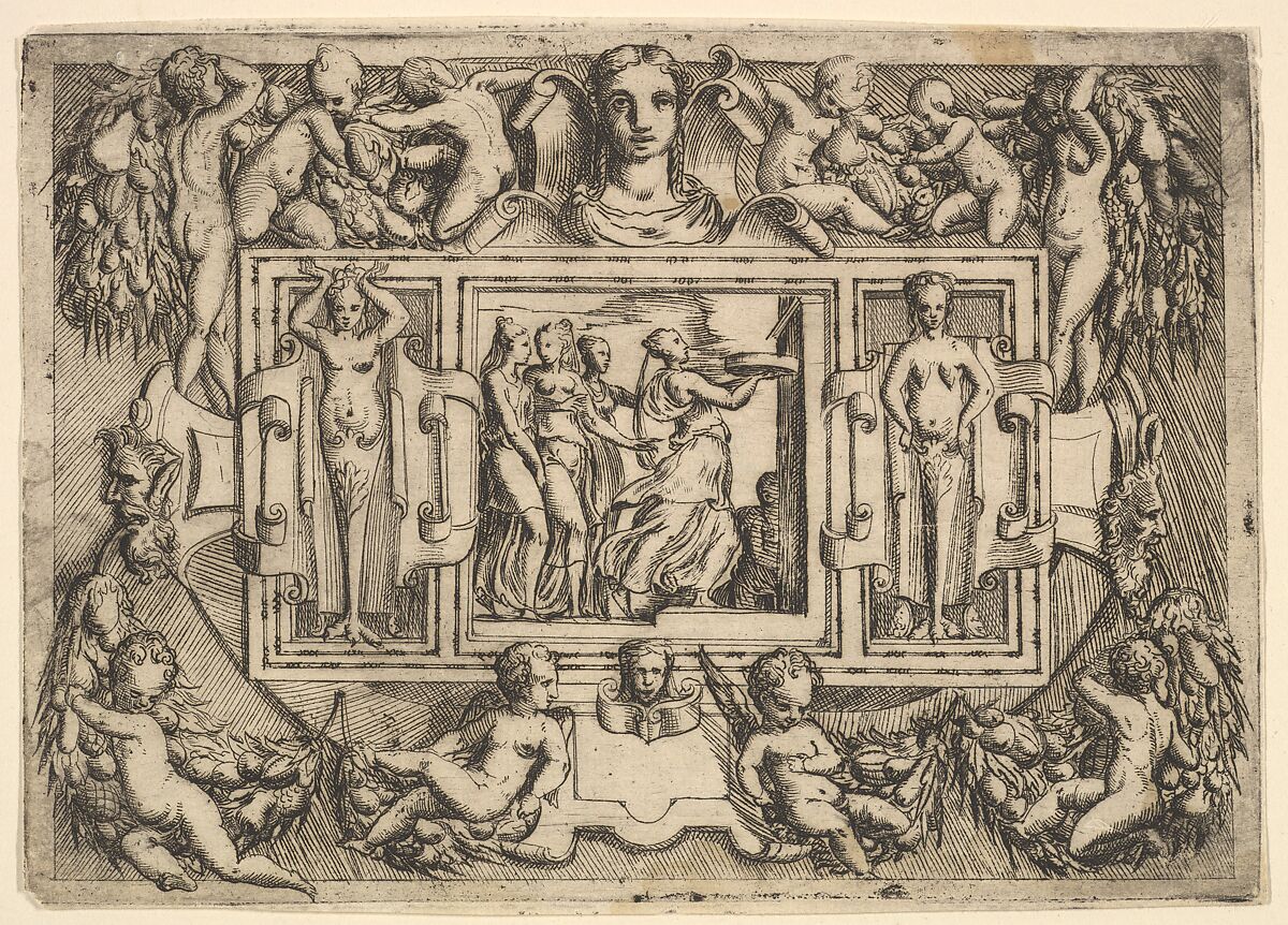 - Title: The Cumeaean sibyl walking to the right and carrying a tray, followed by three women, set within an elaborate frame