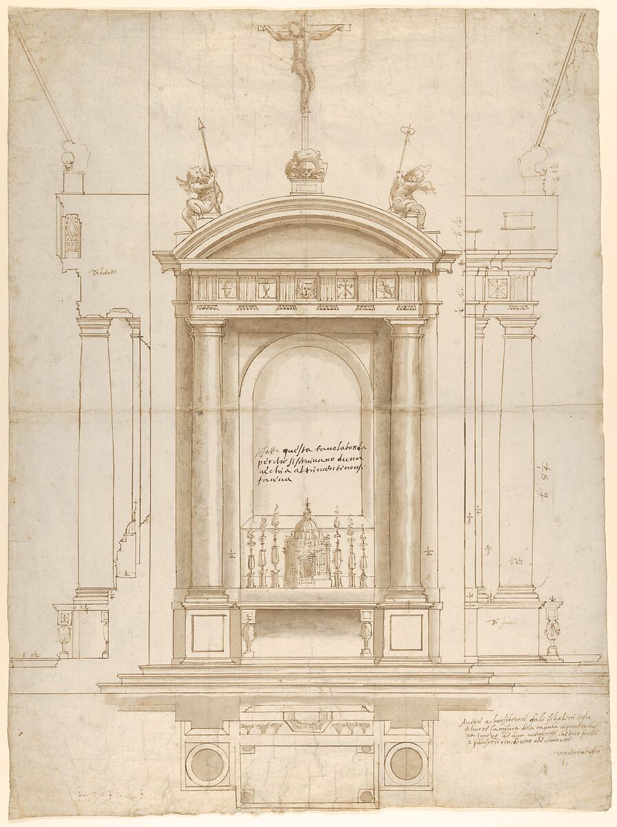 While principally known as a sculptor today, early written sources suggest that Vincenzo de’ Rossi (1525-1587), the successful pupil of Baccio Bandinelli (1488-1560), also had a career as an architect. This newly discovered drawing by the artist, acquired by The Metropolitan Museum of Art in 2013 as an anonymous Florentine design, more satisfactorily substantiates the references found in the sixteenth-century sources (Vasari 1568, and Borghini 1584) and sheds new light on Vincenzo’s activities as a draftsman and architect. The sheet, which depicts a comprehensive design for an altar and is inscribed and signed by the artist at bottom right "Vincentio Rossi", can be considered the first genuine architectural drawing by his hand to surface. It is almost certainly connected to an early and prestigious commission for the altar of the Confraternita dei Virtuosi in the Pantheon, Rome, commissioned from the artist in 1546.