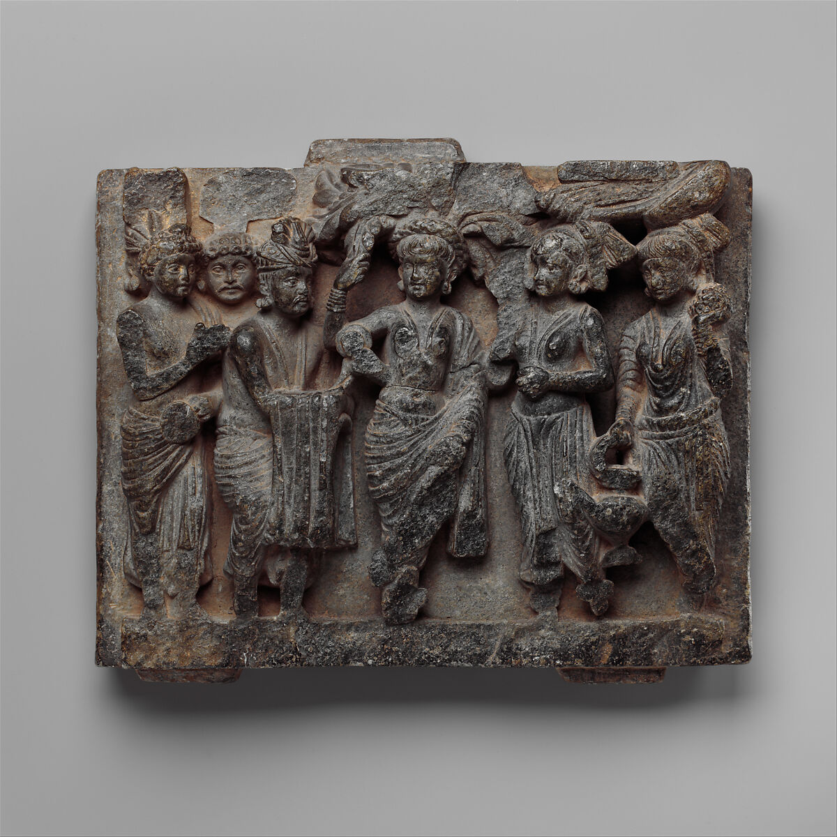 This panel, together with the one showing Maya's dream (1976.402), was part of a larger set that would have sequentially encircled the drum of a small stupa to recount the life of the Buddha. Here, Maya reaches up to grasp a branch of a tree, much like earlier representations of yakshis (female nature deities), and miraculously gives birth to the Buddha out of her right side.