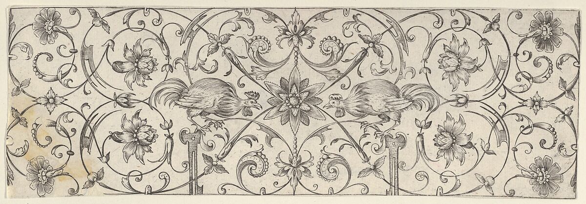 Frieze with a decorative pattern made up out of very delicate, stylized vegetal rinceaux combined with flowers and strapwork elements. In the center of the frieze a flower has been placed with a rooster on either side.