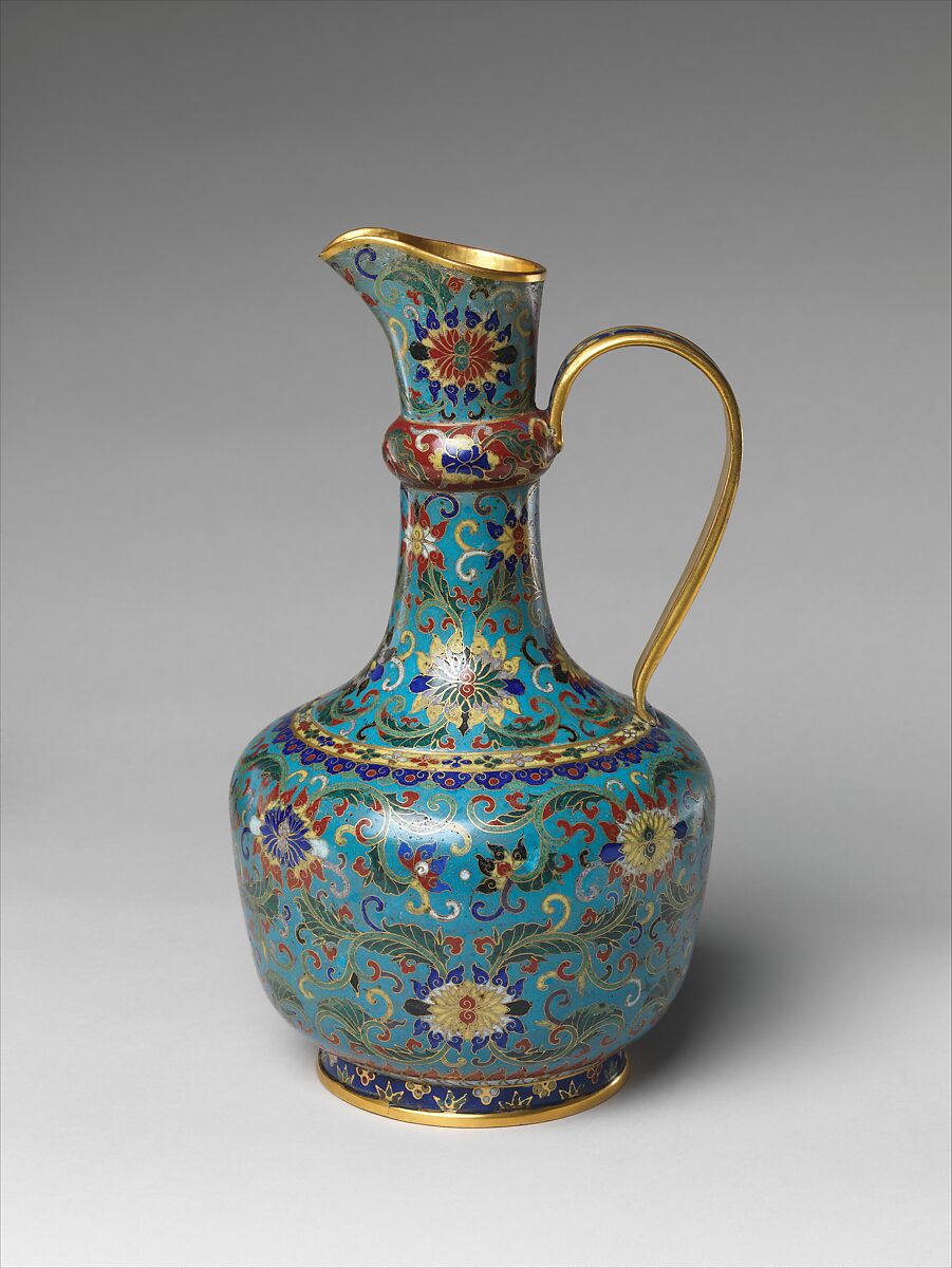 The earliest securely dated Chinese cloisonné, in which colored glass paste is applied within metal enclosures and fired, dates from the reign of the Ming Xuande emperor (1426–35). However, cloisonné is recorded during the previous (Yuan) dynasty (1271–1368), and it has been suggested that the technique was introduced to China at that time via the western province of Yunnan, which under Mongol rule received an influx of Islamic people. The shape of this ewer, which was introduced to China in the early fifteenth century, also derives from Islamic metalwork