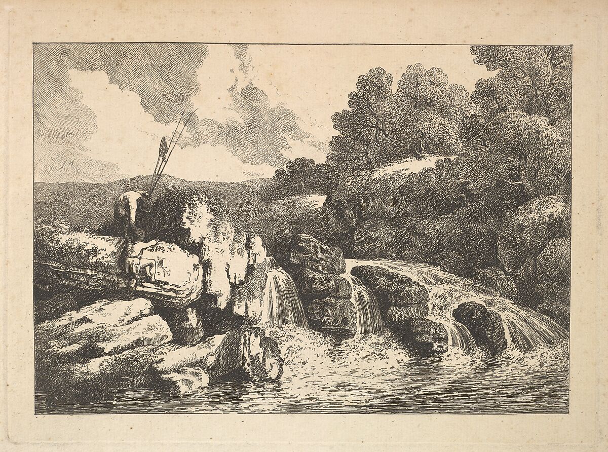 - Title: Landscape with Two Fishermen Climbing Rocks Next to a Waterfall