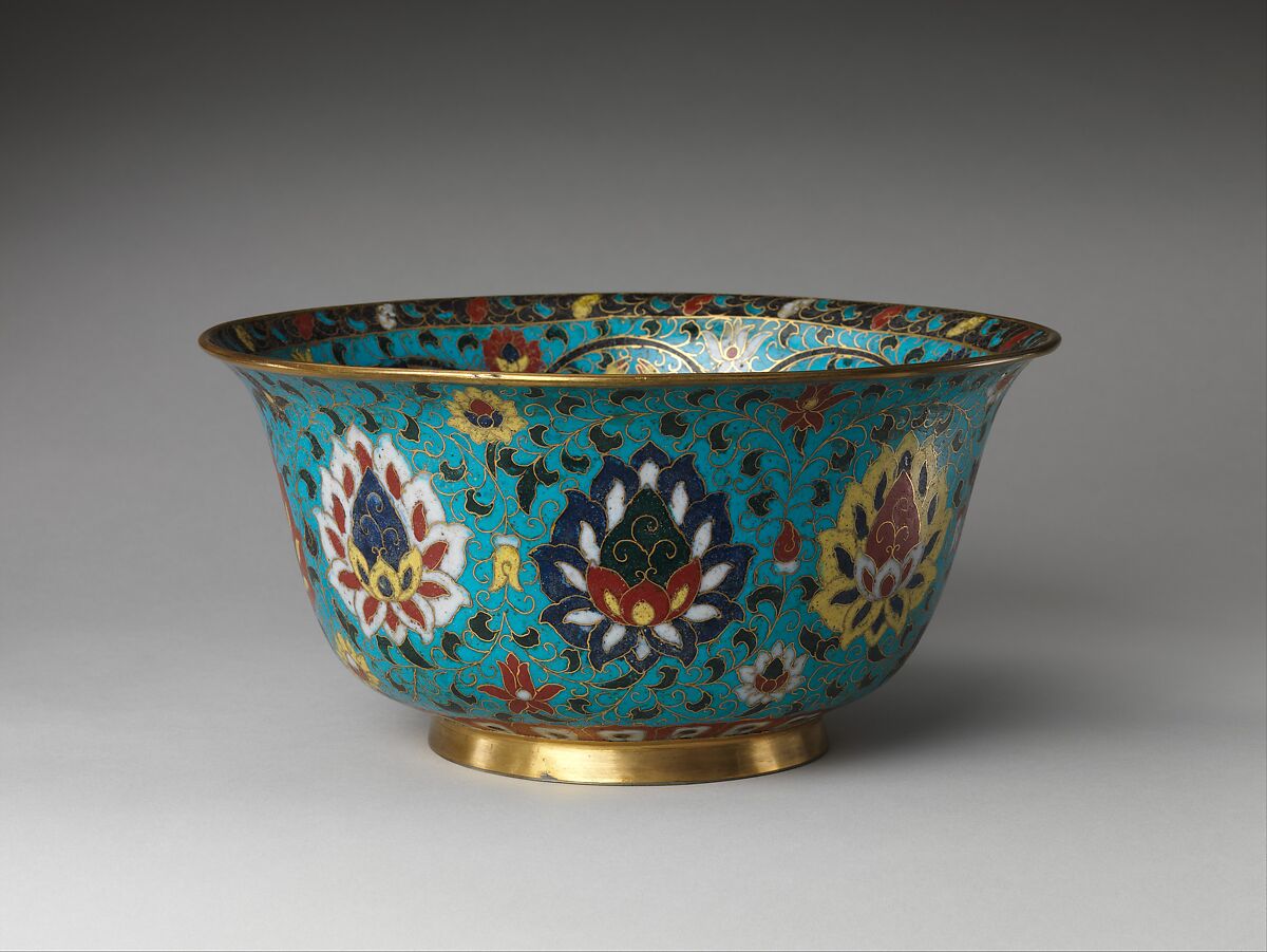 Replete with Buddhist iconography, this large bowl was likely intended to hold offerings on an altar table. The exterior features bold lotus flowers in alternating colors, while the interior shows the Eight Buddhist Treasures: wheel, conch, parasol, canopy, flower, precious vase, two fish, and endless knot. At the bottom of the bowl, two carp swim in a pond, its dark waters contrasting with the luminous gilding of the cloisonné wires.