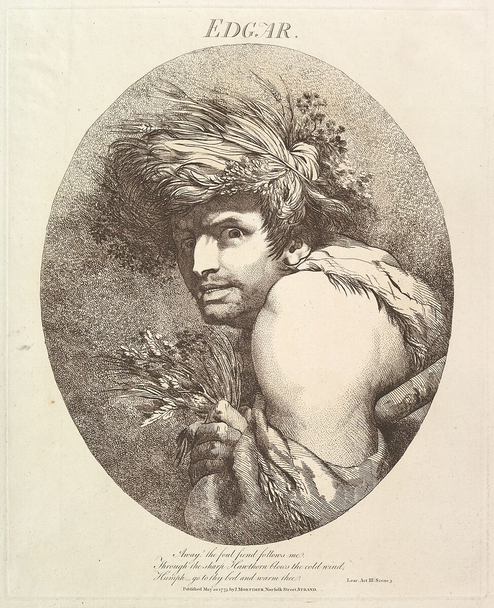 Mortimer admired Salvator Rosa, absorbed aspects of his dramatic style, and sought British equivalents for his subjects. This etching comes from a series that Mortimer devoted to leading Shakespearean characters, based on drawings exhibited at the Society of Artists in 1775. Merging the seventeenth-century genres of the character head and tête d'expression (expressive head), Mortimer's designs also incorporate elements of history painting to convey the Bard's inventive range. Attracted mostly to tragic figures, the artist here portrays Edgar, the eldest son of the Earl of Gloucester, disguised as the demon-possessed Poor Tom. Clad in rags, with weeds woven into his hair, the figure joins the exiled King Lear in a storm, and speaks the following lines: