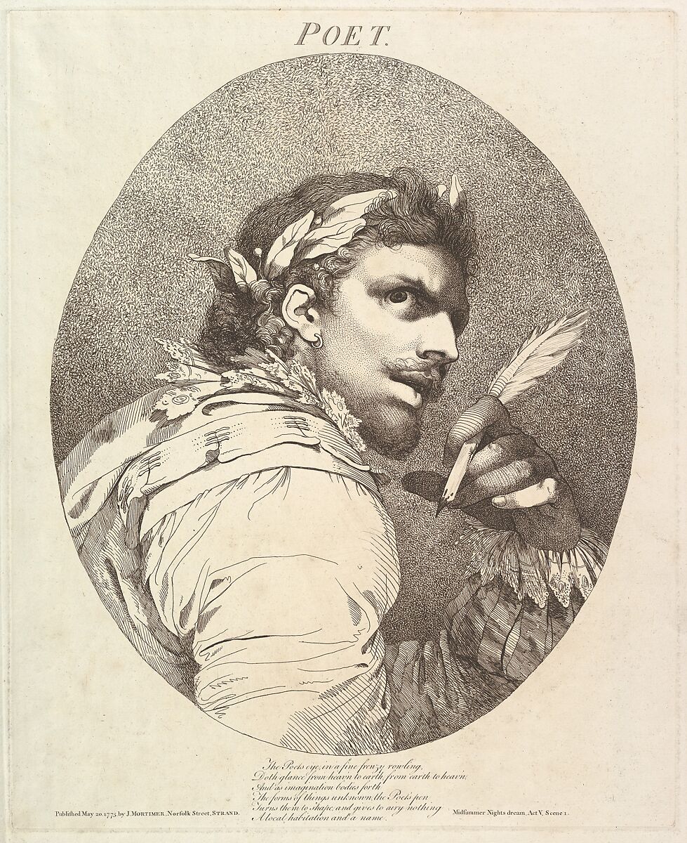 Mortimer admired Salvator Rosa, absorbed aspects of his dramatic style, and sought British equivalents for his subjects. This etching comes from a series that Mortimer devoted to leading Shakespearean characters, based on drawings exhibited at the Society of Artists in 1775. Merging the seventeenth-century genres of the character head and tête d'expression (expressive head), Mortimer's designs also incorporate elements of history painting to convey the Bard's inventive range. Here he represents a poet described by Duke Theseus in "A Midsummer Night's Dream," using the image to suggest that artistic creativity bridges nature and the divine: