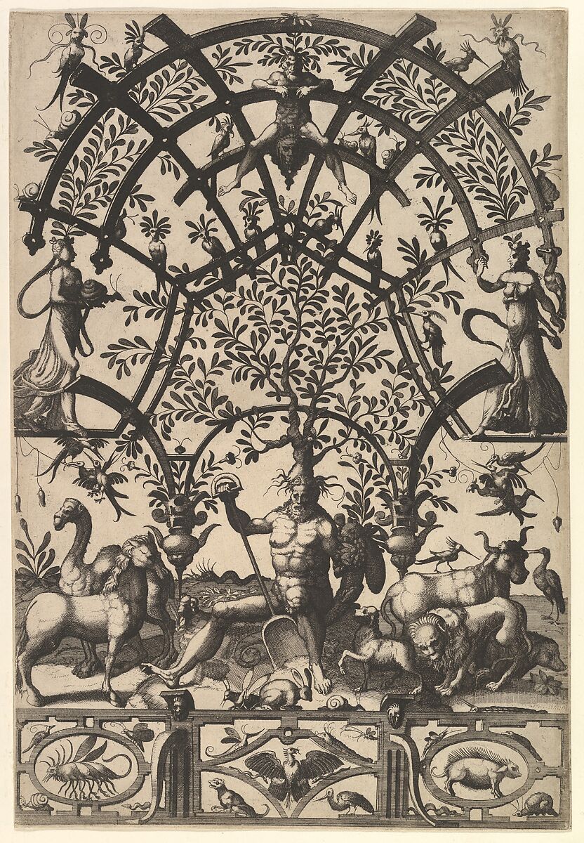 - Title: Personification of Earth, with Spade and Horn, Supporting a Tree and Lattice on His Head, A Frieze underneath from Veelderleij niewe inventien van antijckesche sepultueren diemen nou zeere ghebruijkende is met noch zeer fraeije grotissen en compertimenten zeer beqwame voer beeltsniders antijcksniders schilders en all constenaers...Libro Secundo