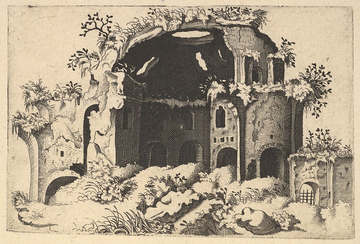 Horizontal plate with a depiction of the remains of a Nymphaeum, historically mistaken for the Temple of Minerva Medica in Rome. The building is depicted as seen from the South, from what is now the Via Giovanni Giolitti. Its foundations are partially burried and the building is covered in plants. The dome of the building is more complete in this depiction than in its modern-day state of preservation. This is congruous with other sixteenth and seventeenth depictions of the building, suggesting that this depiction if based on an in situ obervation of the structure.
