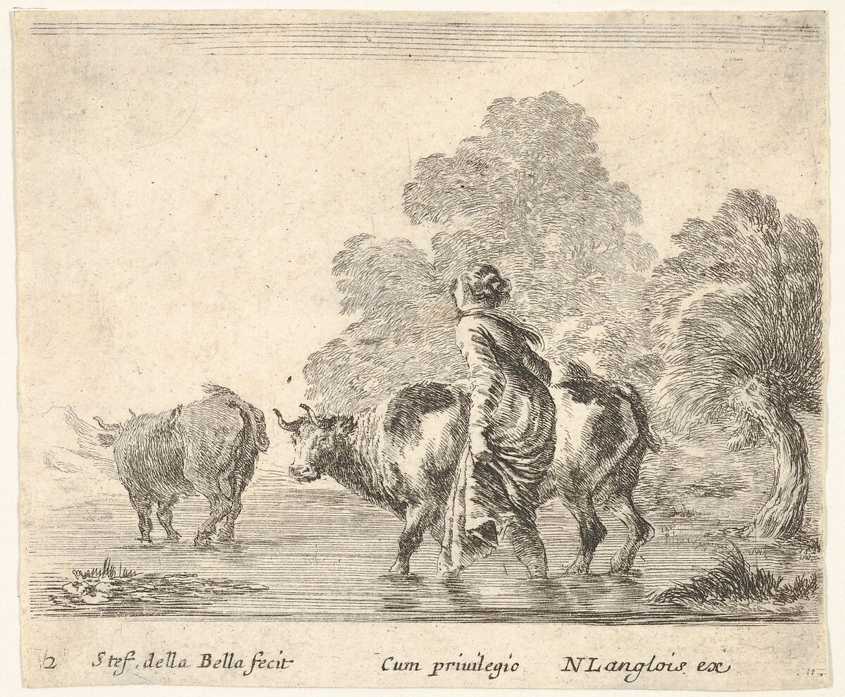 - Title: Plate 2: a peasant woman herds two cows across a stream, walking towards the left, from "Diversi Capricci"