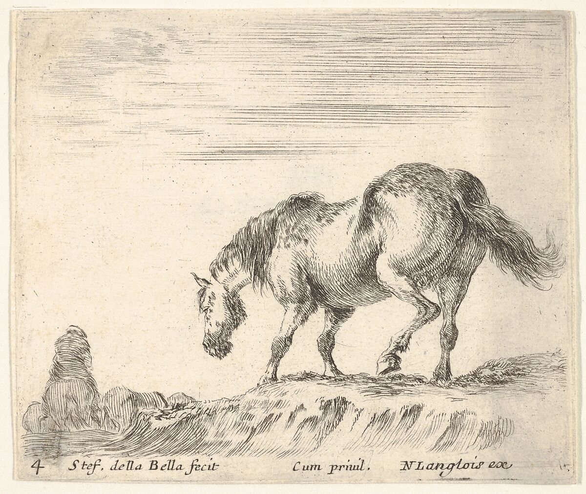 - Title:Plate 4: a horse in profile facing the left, about to descend from a mound, a horseman to left in background, from "Diversi Capricci"