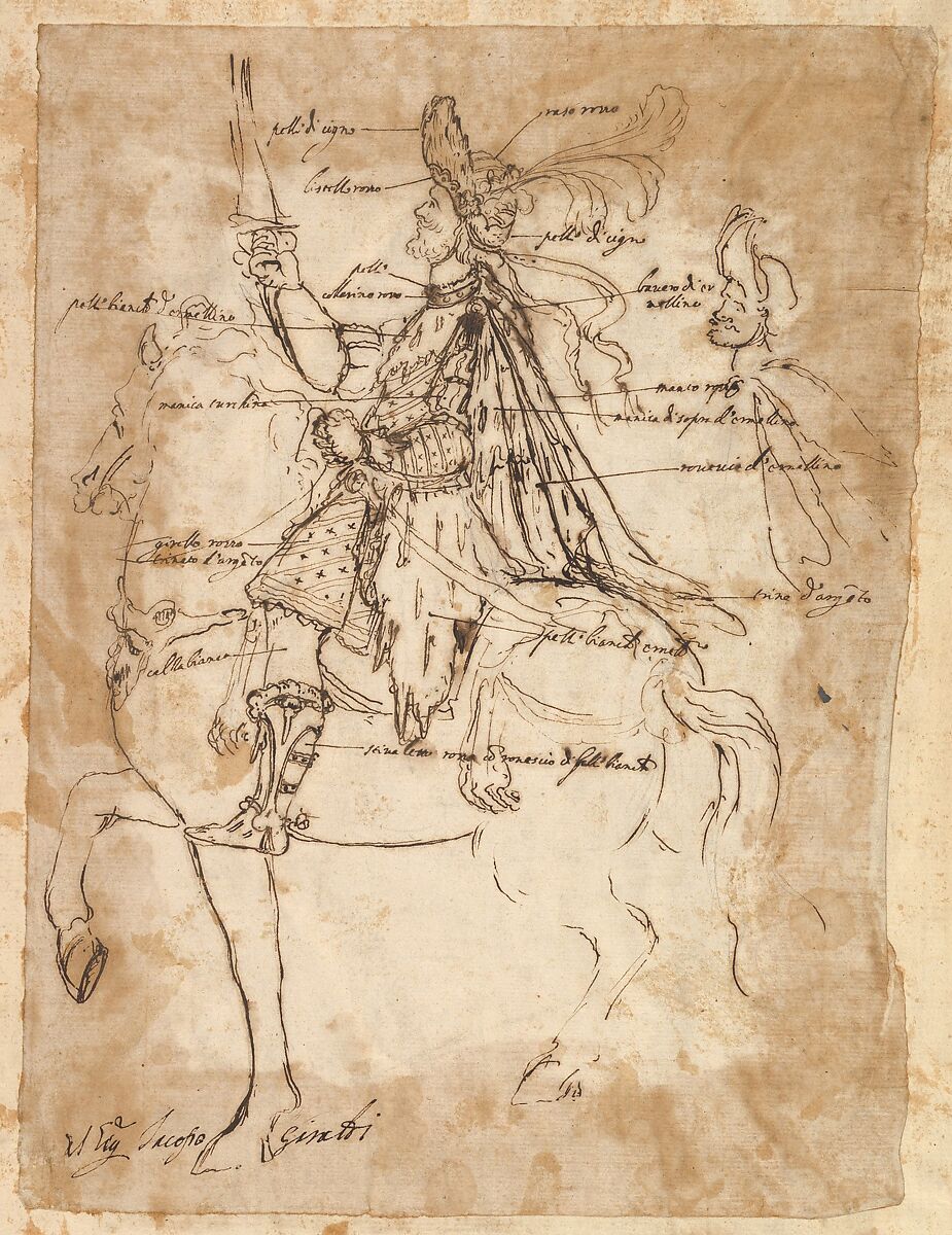 - Title: Costume design for Jacopo Giraldi, depicted on horse back