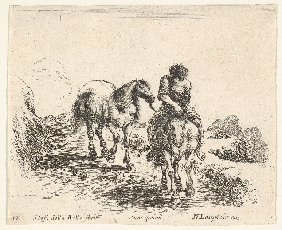 - Title: Plate 11: a young horseman, seen from the front, leading another horse, from "Diversi Capricci"