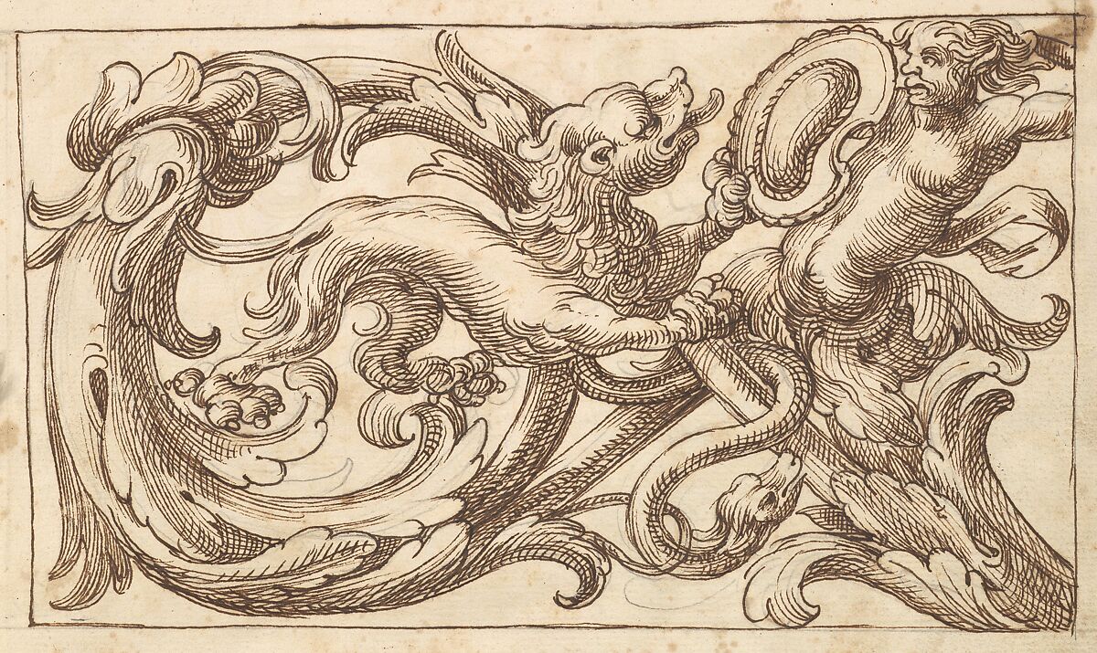 Design for a horizontal panel filled with a meandering acanthus rinceau. On the right side a male figure with a shield, whose lower body consists of acanthus leaves, attacks a lion (depicted in the center). Below them, there is a fantastical creature with the body of a snake and a llama-like head.