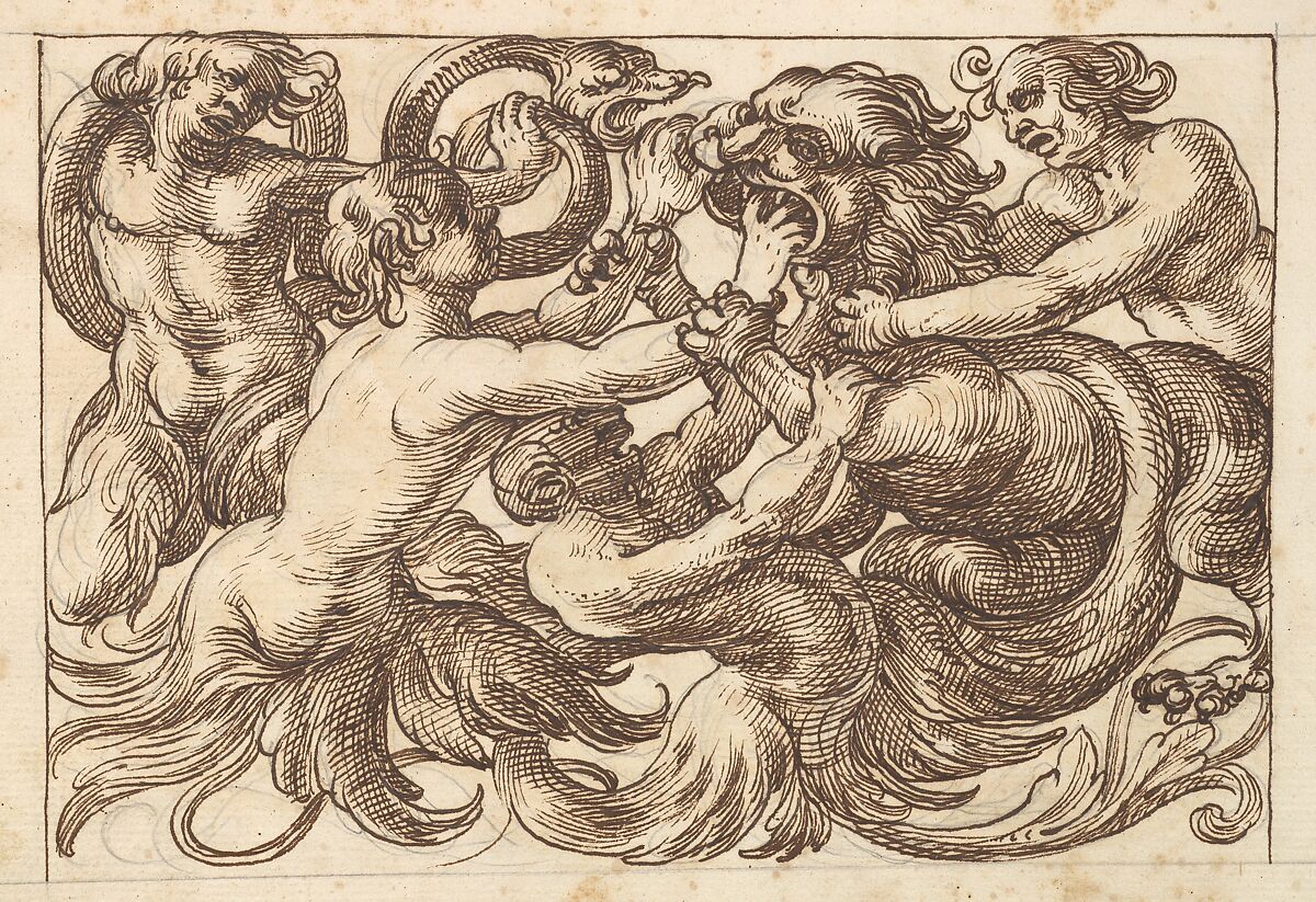 Design for a horizontal panel showing four male figures whose lower bodies consist of acanthus leaves. Three of them are fighting a lion while the fourth, on the left, is struggling with a snake.
