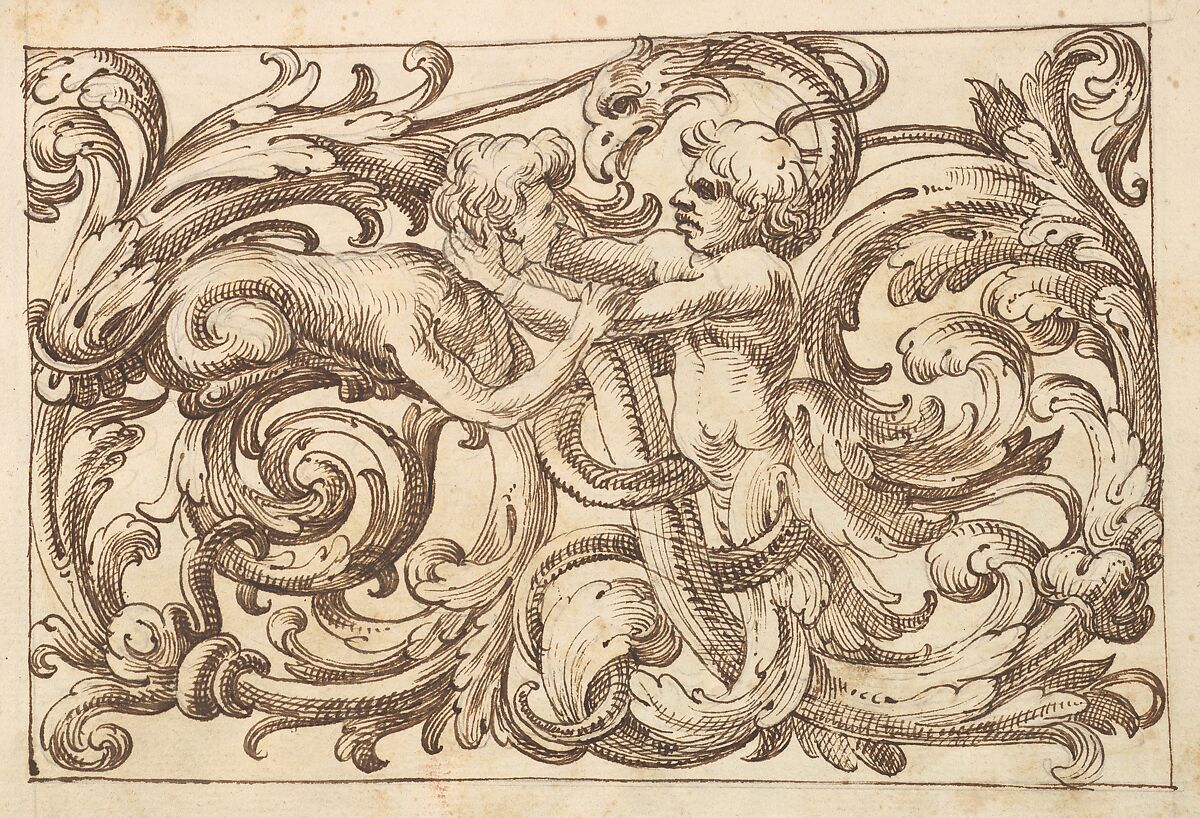 Design for a horizontal panel filled with a meandering acanthus rinceau. In the middle a male figure, whose lower body consists of acanthus leaves, fights with a sphinx-like creature with a male human face. Above them is the head of a snake-like creature with a head shaped like a bird.