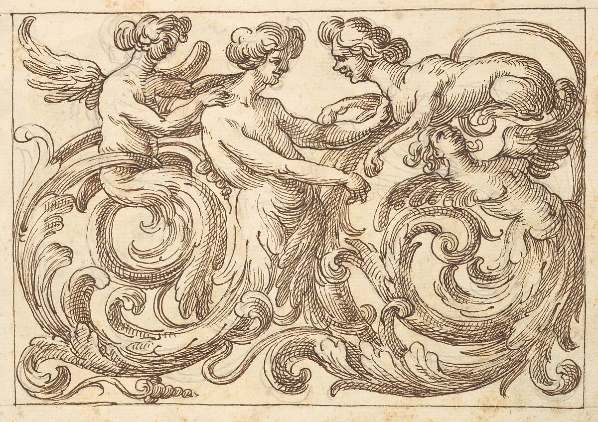 Design for a horizontal panel with three androgynous figures whose lower bodies consist of meandering acanthus rinceaux. On the top right a fourth creature, a sphinx with a human, similarly androgynous face is depicted.
