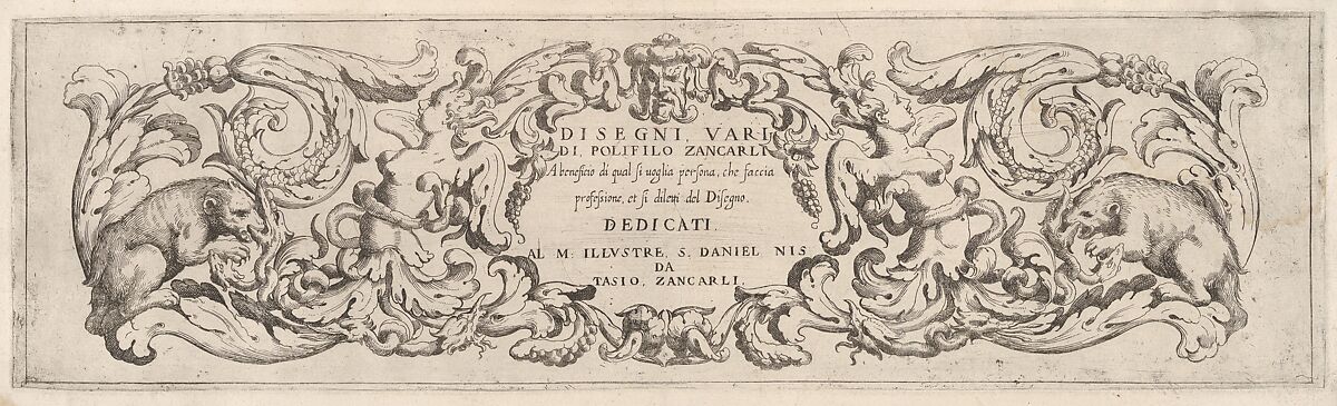 Title page to a series of frieze designs decorated with acanthus scrolls and various figures. The title page is symmetrically organized with a title cartouche in the middle and acanthus scrolls on both sides. The title cartouche is flanked by female hybrid creatures with wings for arms and a lower body consisting of acanthus leaves. Two bears are depicted on the outside of the frieze. Both the bears and the female creatures are attacked by snakes whose bodies blend in with the acanthus scrolls.