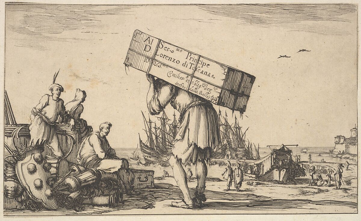 - Title: Title page: a man carrying a case on his back in center, three men looking towards him on left, Medici coat of arms on ground to left, various boats and figures to right in the background, from "Set of eight nautical landscapes" (Suite de huit Marines)