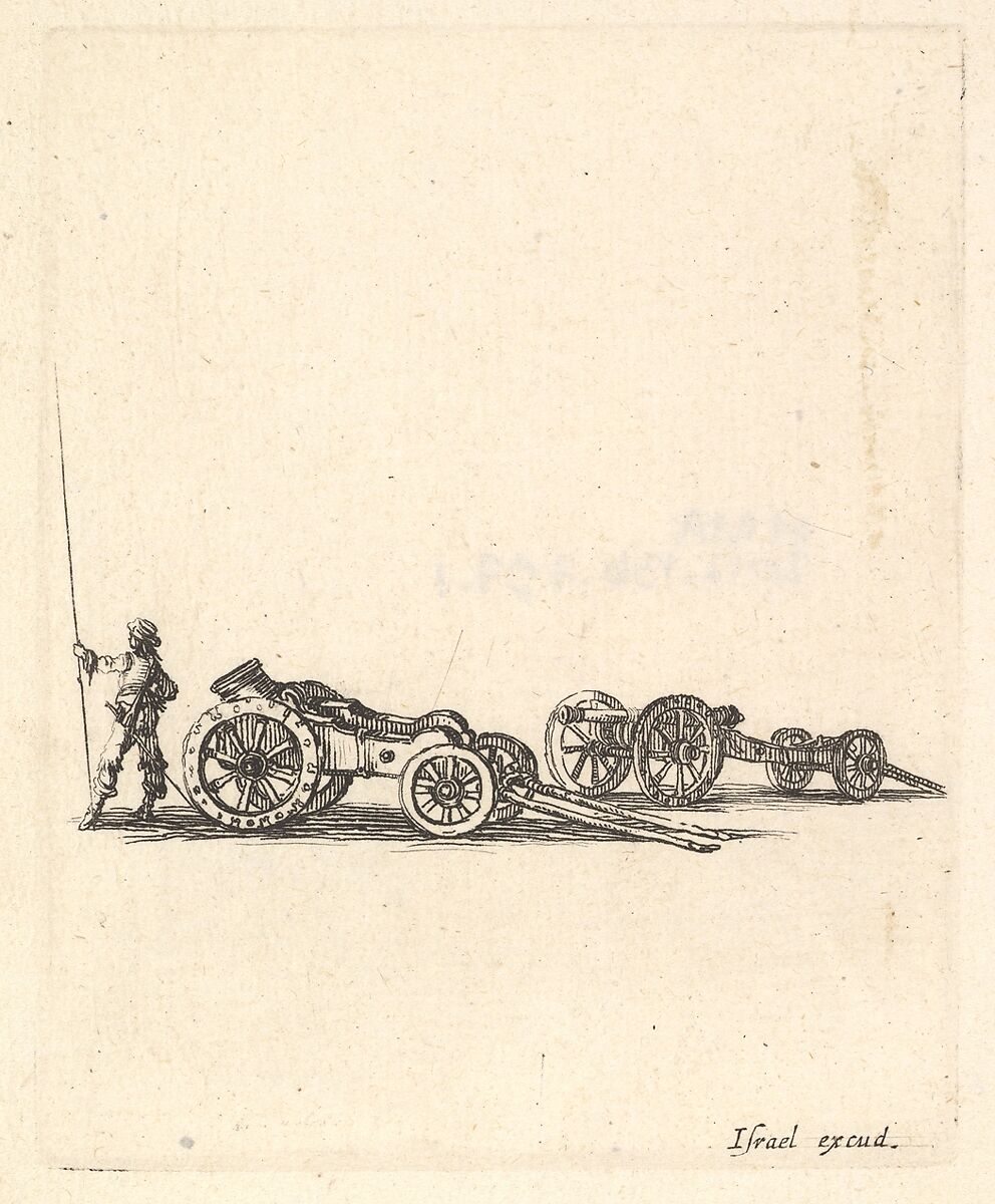 - Title: A mortar and a cannon, both mounted on carriages, a soldier shown from the back stands to the left, from "Equipment needed for Fortification" (Recueil de diverses pièces très nécessaires à la fortification)