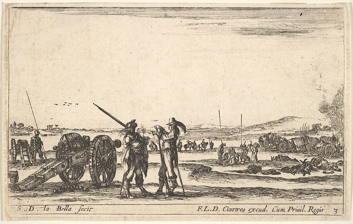 - Title: Plate 3: An officer giving orders to a soldier in centre foreground, cannon at left, from "Various Military Caprices" (Varii capricci militari)