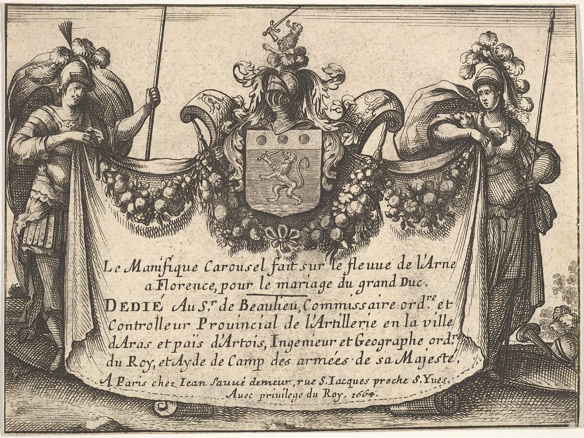 - Title: Title page from "The magnificent pageant on the Arno in Florence for the marriage of the Grand Duke" (Le Magnifique carousel fait sur le fleuve de l'Arne a Florence, pour le mariage du Grand Duc)