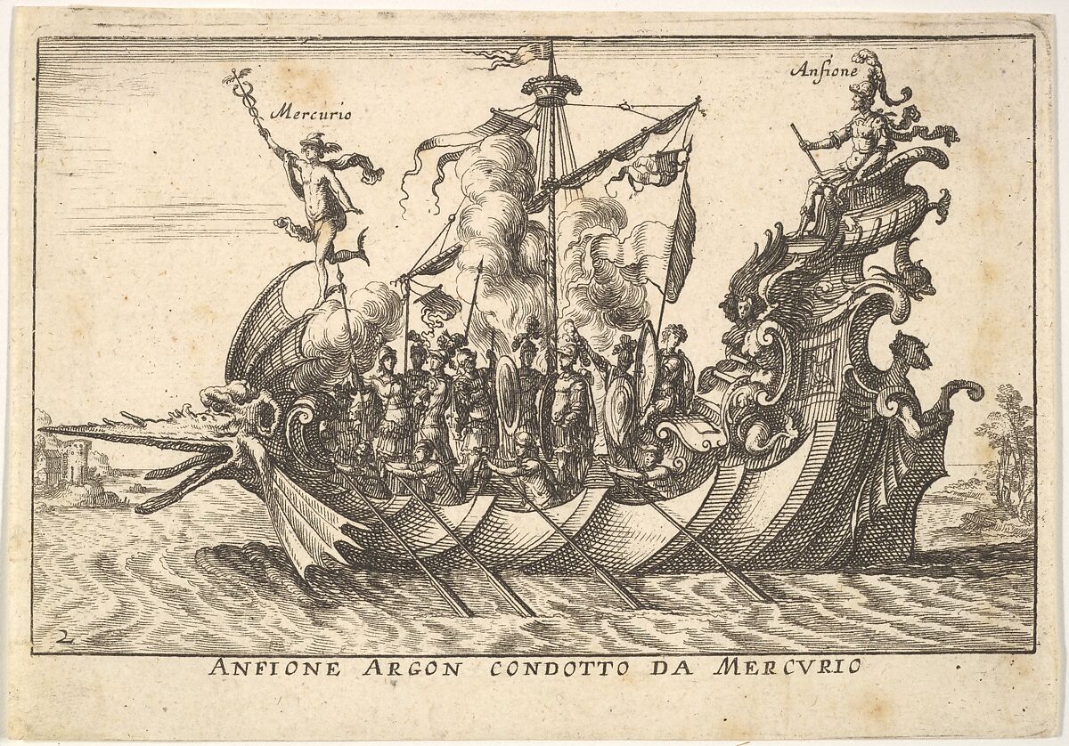 - Title: Plate 2: The Argonaut Amphion led by Mercury (Anfione Argon. condotto da Mercurio), from "The magnificent pageant on the river Arno in Florence for the marriage of the Grand Duke" (Le Magnifique carousel fait sur le fleuve de l'Arne a Florence, pour le mariage du Grand Duc)