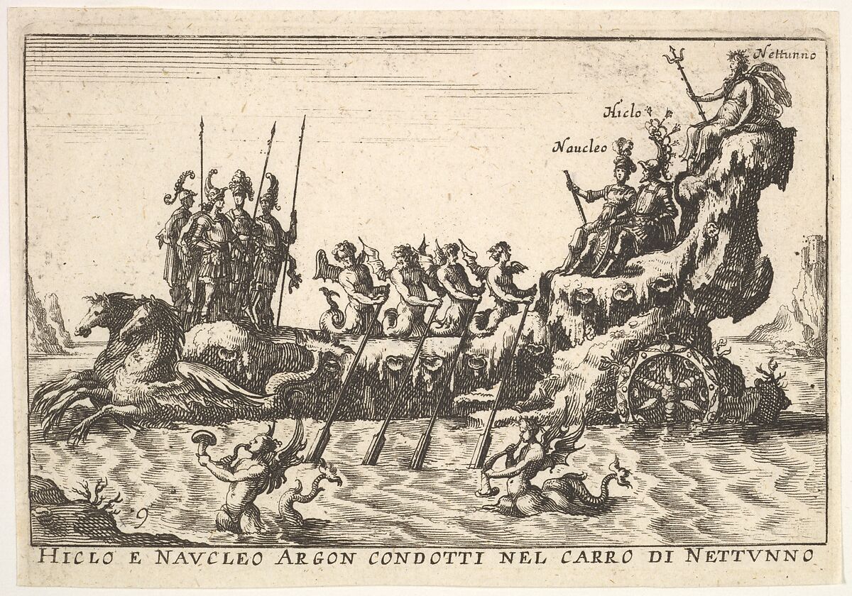 - Title: Plate 9: Argonauts Hicleus and Naucleus led in the float of Neptune (Hicleo e Naucleo Argon. condotti nel carro di Nattunno), from "The magnificent pageant on the river Arno in Florence for the marriage of the Grand Duke" (Le Magnifique carousel fait sur le fleuve de l'Arne a Florence, pour le mariage du Grand Duc)