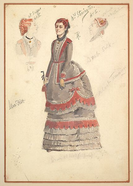 Design for the costume for 'Mrs. Stonington' for the first act of the play 'Captain Jinks of the Horse Marines'. 'Mrs. Stonington' is displayed in three-quarter pose. She is wearing a grey silk dress combined with red velvet trimmings and she is holding a red umbrella. A bust-size drawing of 'Mrs. Stonington' for Act III is depicted at top left. At the top right is a profile sketch of 'Mrs. Stonington' wearing a red velvet and black lace hat.
