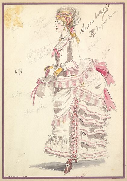 Design for the costume for 'Second Ballet Girl' for the play 'Captain Jinks of the Horse Marines'. 'Second Ballet Girl' is displayed in profile view facing left. She is wearing a white silk and piqué dress combined with pink silk ribbons and detailing. She wears a tight bodice and a Victorian bouffant skirt. She is holding a white silk and piqué purse with pink silk straps and ribbons.